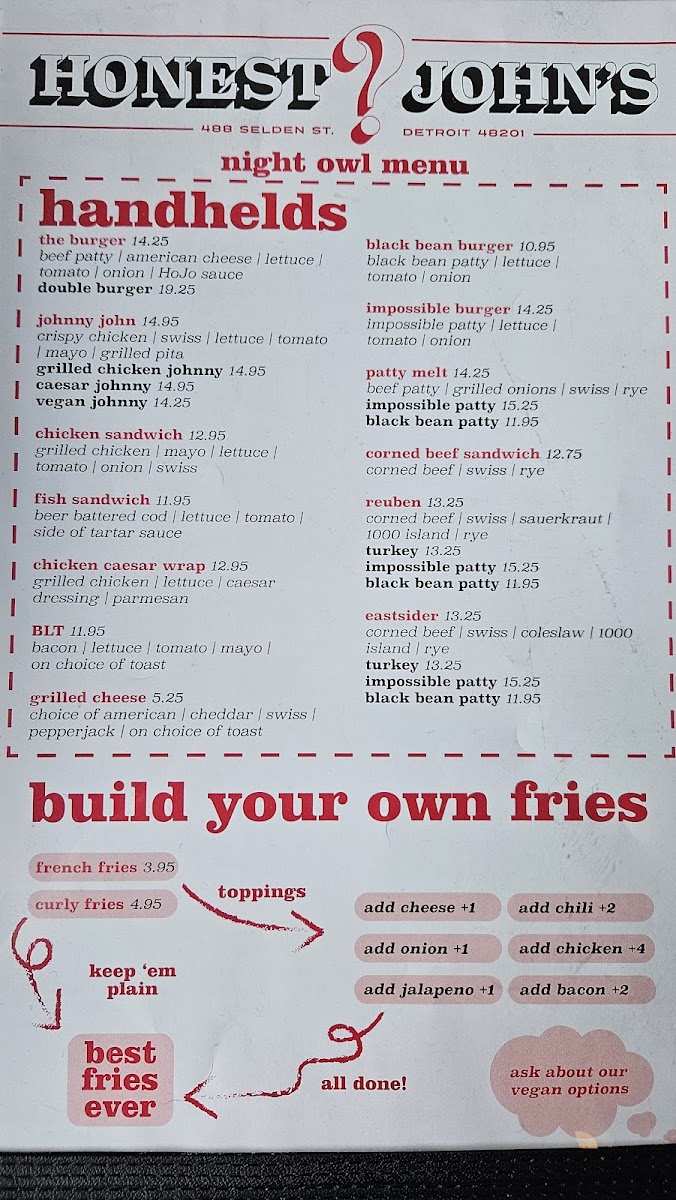 Welcome to Honest John’s, a beloved culinary gem nestled in the heart of Detroit at 488 Selden St. Known for its vibrant atmosphere and eclectic menu, Honest John's is not just another diner; it’s a dining experience that captures the spirit of flavorful indulgence and affordability.